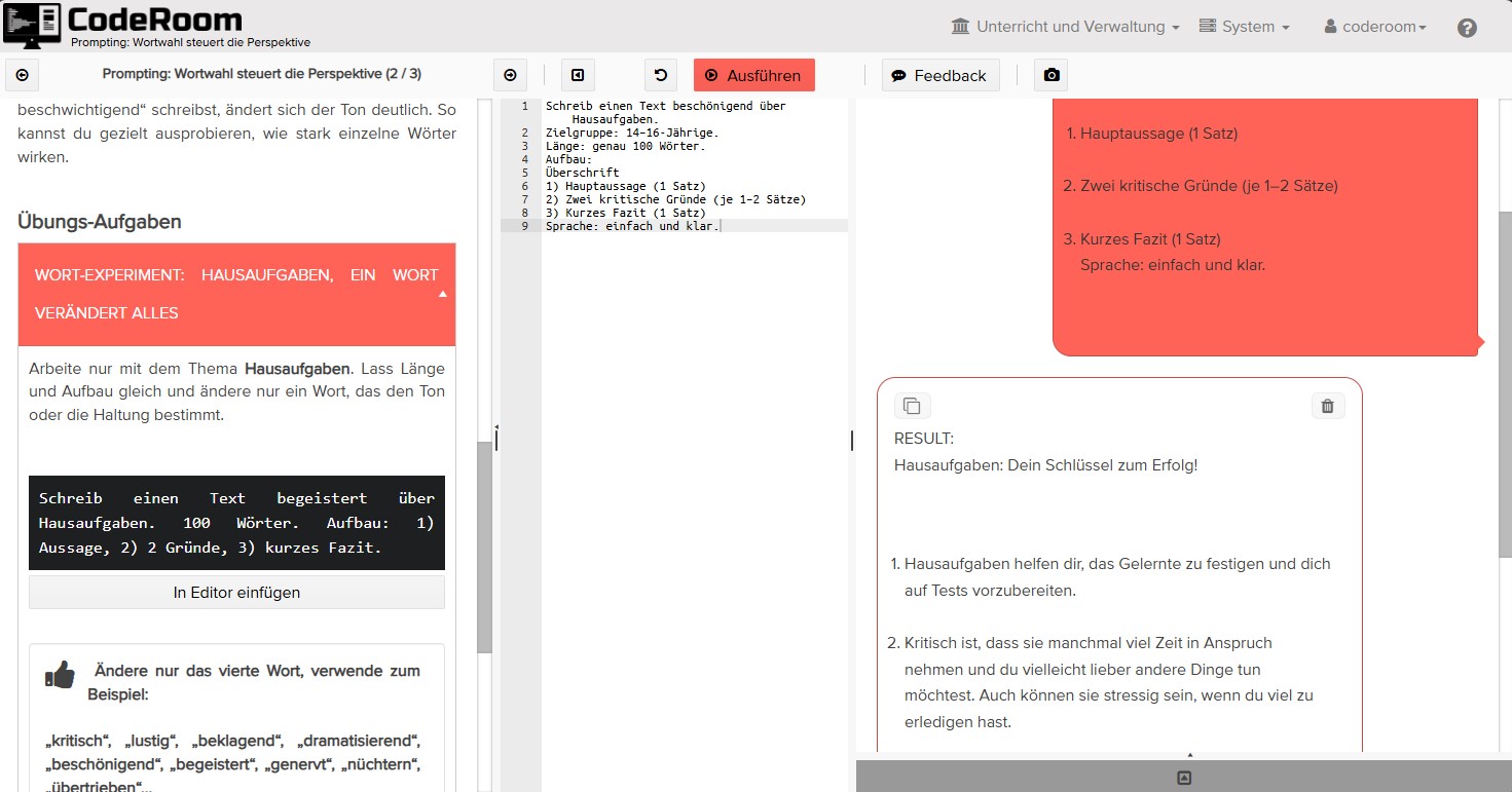 | Prompting: Wortwahl steuert die Perspektive | Wirkung lenkender Wörter und Neutralisierung einseitiger Formulierungen | 15 min |